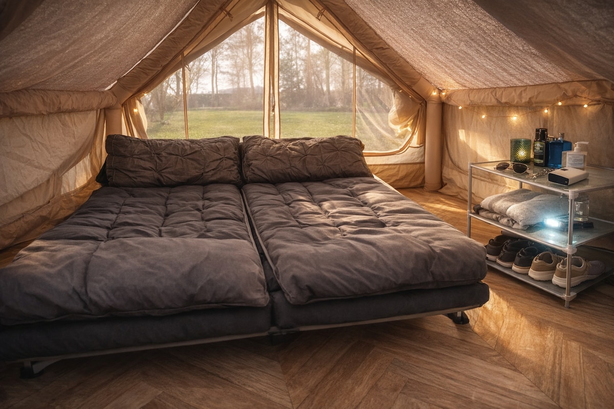 Overnacht in een van onze accommodaties in het groen aan de bosrand van de prachtige bossen van Lierop. Luxe ingerichte bell-tenten voor 2 personen. Je bed kan worden verwarmd met electrische deken Op ons terrein vind je een luxe sanitair gebouw en een sauna. De gedeelde buitenkeuken is voorzien van de basisbehoeften om te kunnen koken. Er is een koelkast, vriezer, kookplaat en een Nespresso apparaat. Er is gezellige buiten plek waar je heerlijk kunt picknicken en BBQen.