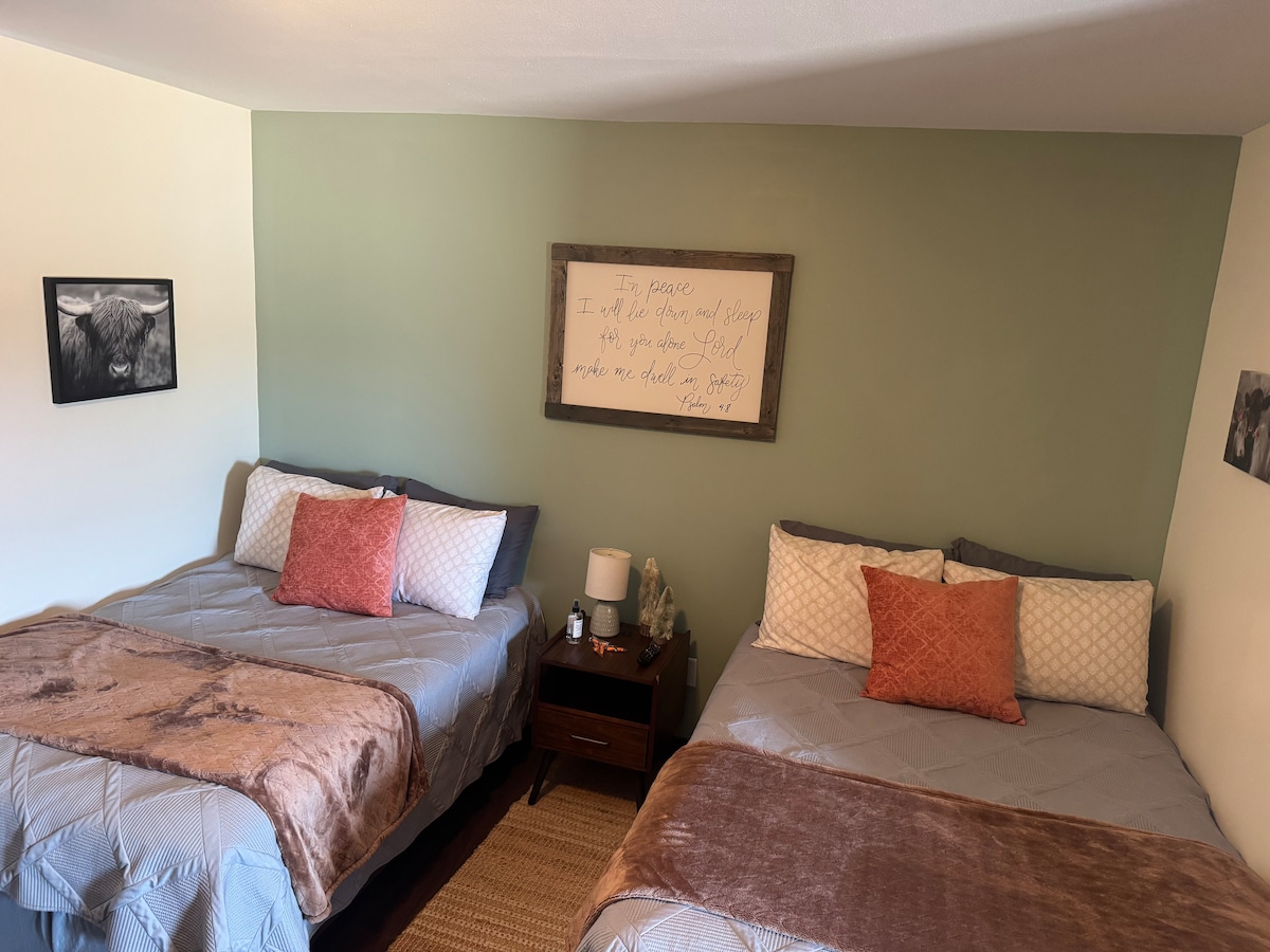 Freshly remodeled with modern finishes and stylish vinyl flooring, this spacious Double Queen Room is designed for comfort and ease. High ceilings and a tall window fill the room with natural light, while blackout shades offer privacy and a peaceful night’s sleep. Located on the main floor, Unit #3 has a private exterior entrance for quick and easy access. This smoke-free room is pet-friendly (dogs only), with a $40 pet fee per pet, per stay—because your furry friends deserve a getaway too.