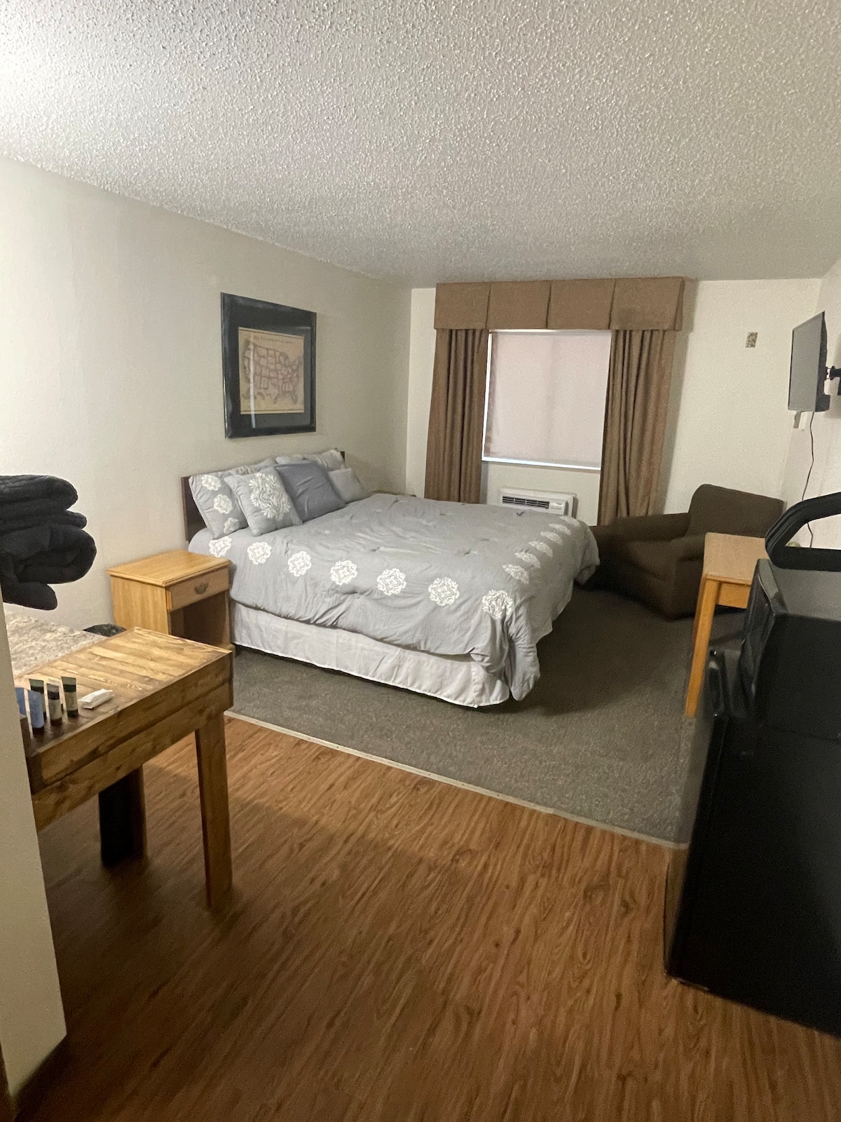 Our studio style hotel room is completed with new flooring and furniture. Includes a queen bed, side table, mini fridge, microwave, toaster oven, dresser, free Wi-Fi, cable tv, and a side chair. Free parking with room for trailers, and a backyard space. We do require photo ID to be sent via Airbnb messages to verify your identification before you’re able to access the property.