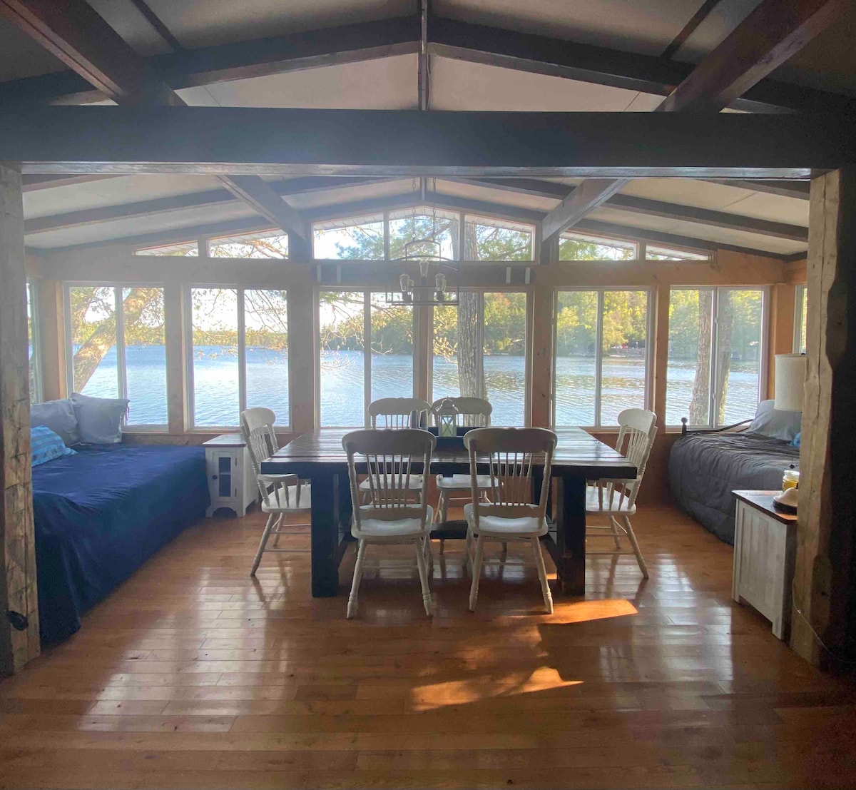 The cottage is centrally located on Chandos Lake, just 2.5 hours from Toronto and 15 minutes away from the quaint town of Apsley. In the summer, dive off the brand new dock into deep water or ease into shallow sandy waters on the custom stone staircase. Perfect for swimmers of all ages and abilities. In the winter, spend a cosy day indoors or enjoy time outdoors. Two cross country ski/snowshoe locales—Kawartha Nordic Ski Club and Silent Lake Provincial Park—are within a half-hour drive.