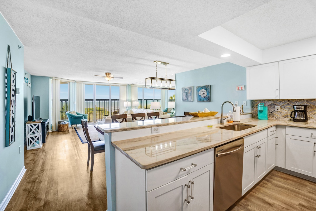Spectacular views from every room in this one of a kind, 2 bed, 2 bath condo with large private balcony! Each Bedroom has a queen bed, large smart tv, closet, and fresh linens. Each of the squeaky clean bathrooms have walk in tile showers, shampoo, conditioner, soap, and fresh towels. The kitchen is stocked with pots and pans, plates, mugs, glasses, silverware, keurig, blender, and some spices. Beach chairs, umbrella, beach towels, cooler, and beach cart included! Your Beach Home awaits you!