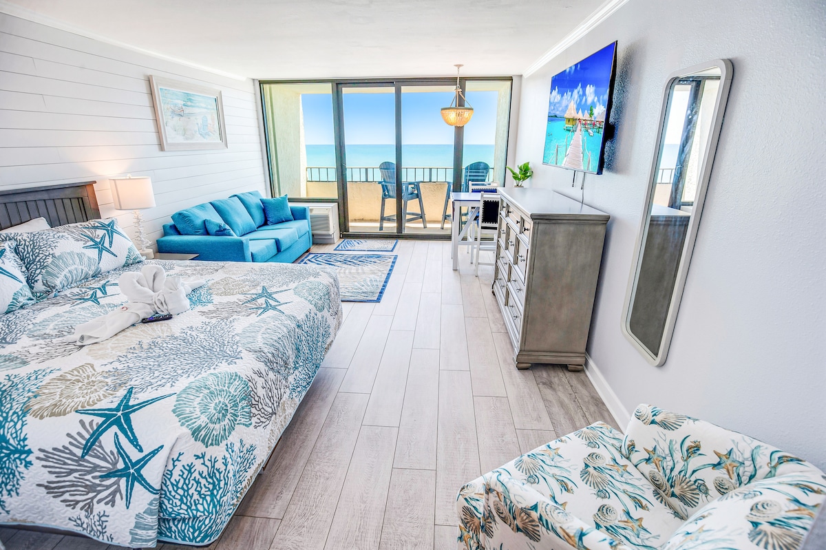 We are excited to say: the beaches, pools, and restaurants are now open! This condo is professionally cleaned!! Key Features of this condo include: * Oceanfront One Bedroom at Sandy Beach Resort * 1 King Bed, with Sofa Bed, Sleeps up to 4, sheets provided * Private Bathroom * Fully Equipped Kitchen, with Kitchen Table * High-speed FREE Wi-Fi * FREE Parking * Indoor and Outdoor Pools, Lazy Rivers and Hot Tubs * Short walk to 2nd Avenue Pier and Family Kingdom Amusement Park