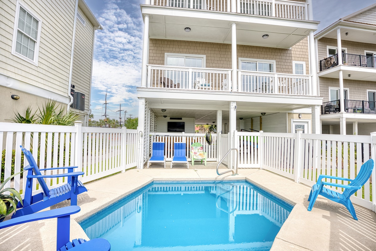 "Attitude Adjustment" is a luxury channel home with a walkway and floating dock giving access to the canal for your fishing and boating pleasure. Home features 4BR, 2BA. Short one block walk to Cherry Grove Beach. Everything you need for your beach vacation in a raised channel home with your own private pool. Guests will find all of the modern conveniences of home, but with a rustic coastal feel.