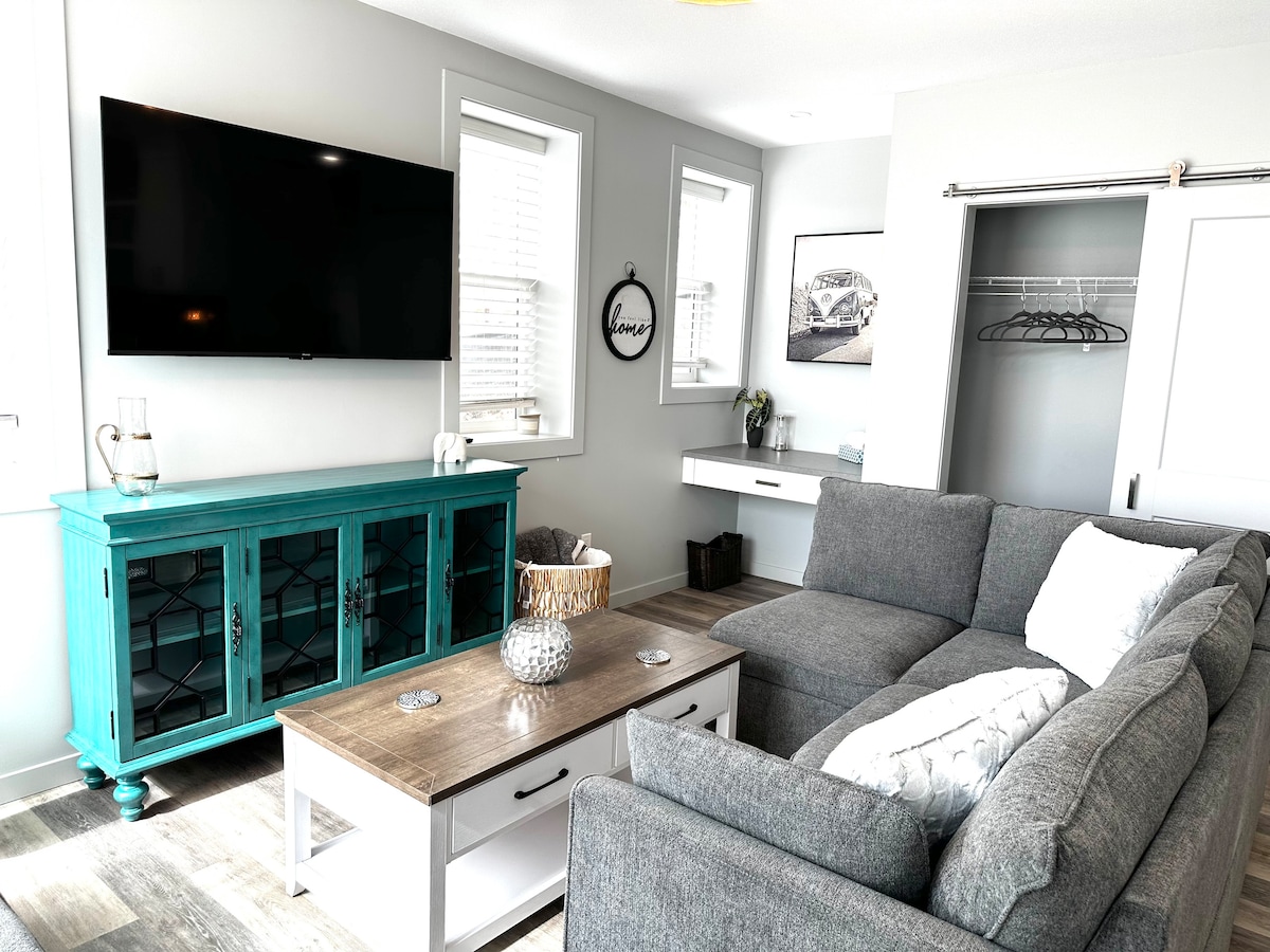 Clean. Quiet. Private. Watch the sunrise over the mountains each morning from the large deck of this brand new carriage house. A full kitchen with large island for convenient meal prep. Cozy living space with fireplace, blankets and Netflix when it comes time to chillax. Fabulous glass shower. Comfortable queen bed plus a pull out sofa. Walk to playgrounds. Safe and central rural location. Plenty of street parking. Garage parking available for smaller vehicles. (Access from inside).