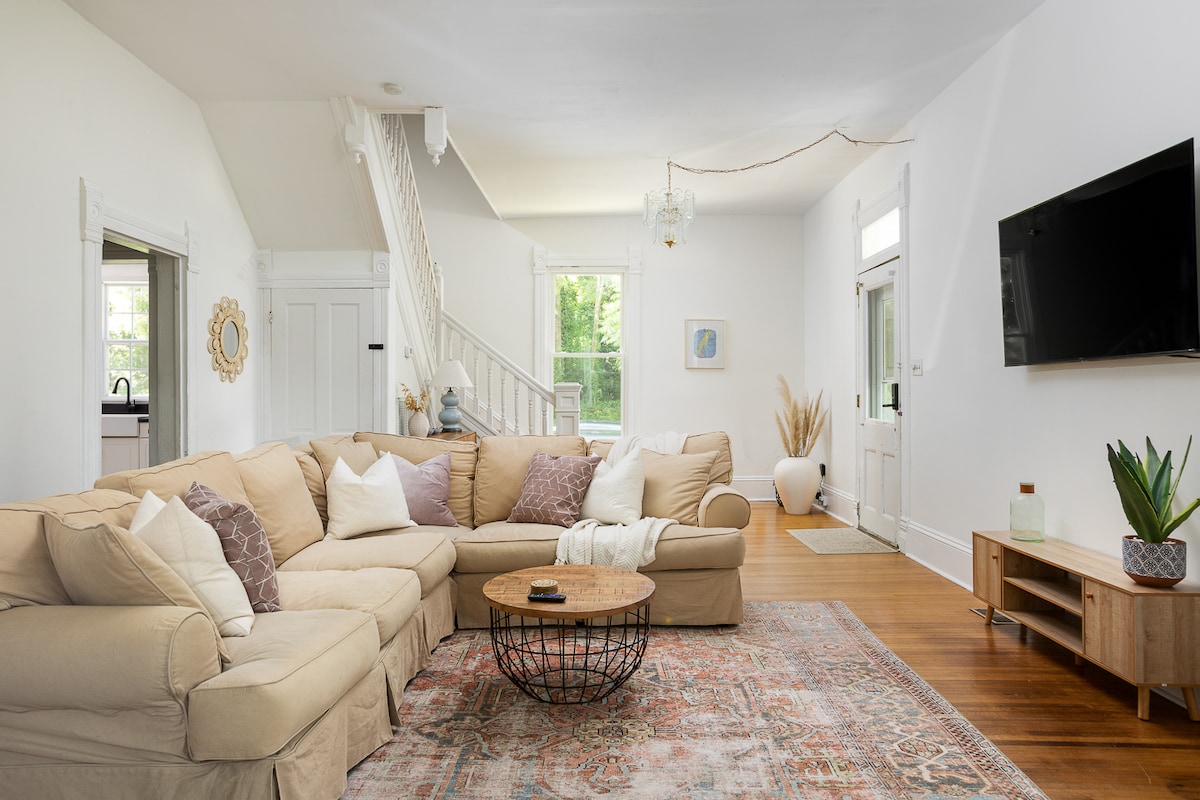 You'll be close to everything in Cape Charles! Experience a fully renovated 1900’s Victorian duplex centrally-located! Next to the park, 2 short blocks to Main St. & beach! Your upstairs bedrooms share a Jack and Jill bathroom. Full kitchen with washer/dryer. 2 outdoor living areas to sip your coffee or wine! Your family will feel cozy and relaxed while you're on vacation! • Front Porch Swing & Backyard Brick Patio w/Grill • Beach Gear, Fun Toys, Pickleball • Modern Kitchen, Dining, Wood Floors