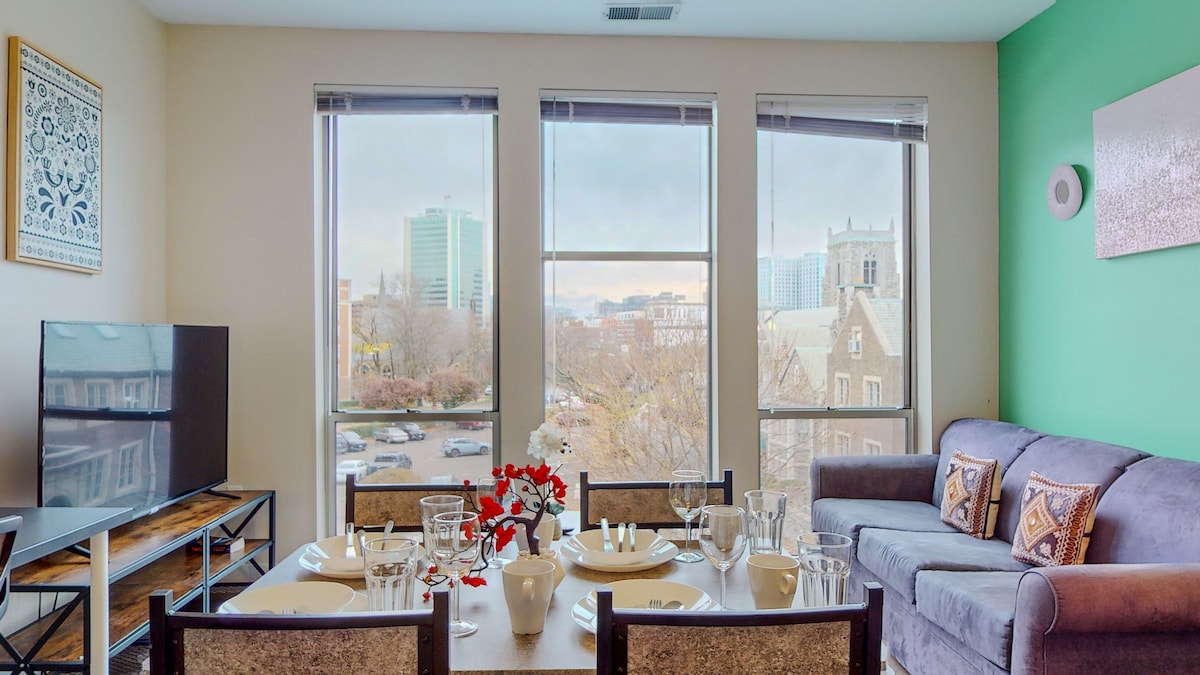 Surround yourself with style, comfort, and sunlight. Conveniently located downtown, offering beautiful city views creating nothing but good vibes wether you are working or visiting. The apartment is light and bright during the days, and very cozy and quaint in the evenings. Comfortably sleeps 4 adults. Walking distance to shopping, theaters, restaurants, parks. Wi-Fi, reserved covered parking, workout facility and laundry room, safe friendly front desk