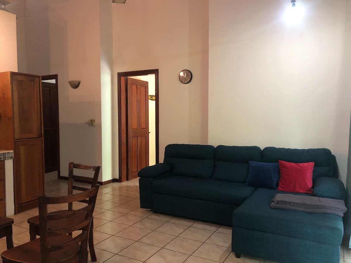 Located in the center plaza of Playa Carrillo. This upstairs studio apartment is a 8 minute walk to the most beautiful beach, and lookout for the best sunset! This fairly new apartment is made of wood, and recently finished with all new appliances and a fully equipped kitchen. The apartment has air conditioning, hot water, high speed internet, and cable TV including Netflix. Supermarket and local restaurants are all within walking distance. The host can take you to private beaches & tide pools.