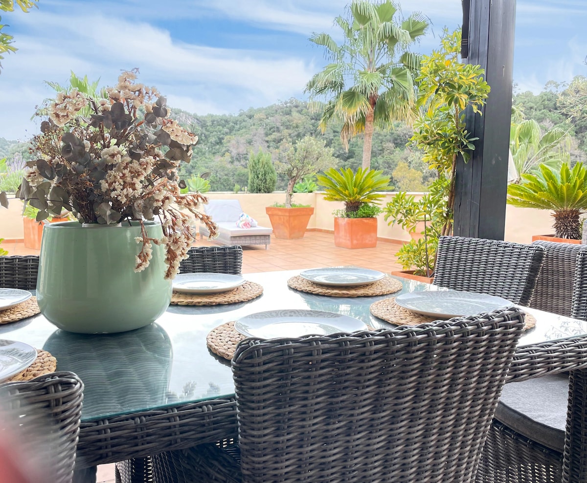 Kick back and relax in this Haven. Welcome to your dream vacation home in the heart of Benahavis, where luxury and stunning views come together to create a truly unforgettable getaway. Space: Step inside and discover a meticulously designed haven, where every detail has been carefully selected for your comfort and enjoyment. From the exquisite furnishings to the thoughtful accents, this two-bedroom, two-bathroom apartment exudes opulence and stylish space.