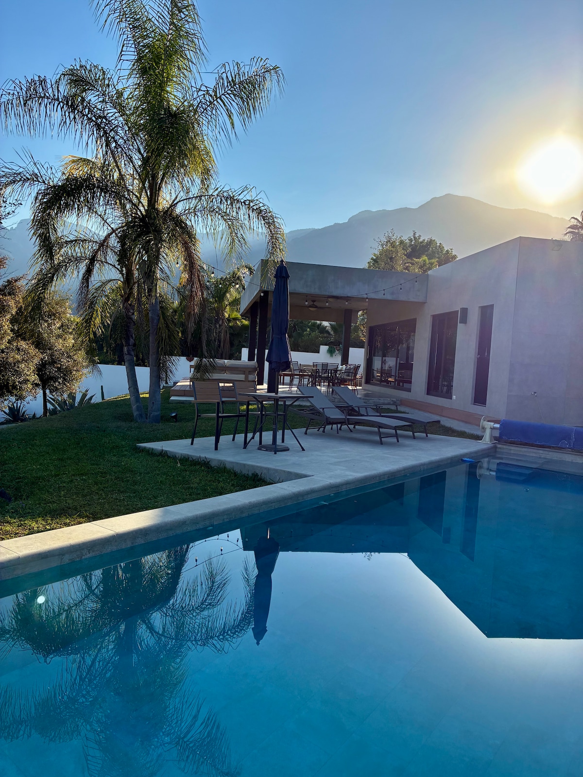 Estilo industrial (climatizada) Ideal para disfrutar en familiar, salir de la rutina, vista espectacular a las montañas, amplia terraza y bellísima alberca sin calefacción, segura. no reuniones masiva ni invitados, niños pequeños y bebés cuentan como extras.. lo usan seguido para GEATTING READY asador, portón eléctrico, totalmente bardeada, malla electrificada, subes tu vehículo a la altura de la terraza y así el acceso a discapacitados. Máx 2 mascotas(reglamento)y 400 mts de terracería