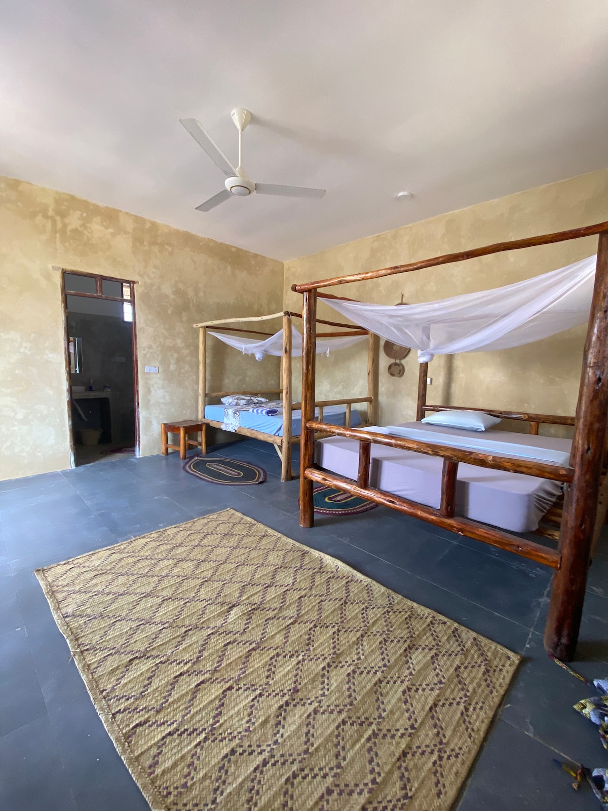 Wide and stylish rooms at ground floor, furnished with Zanzibary style. Four king size beds with mosquito nets, private bathroom and a mini fridge. Huge balcony which is face to the beautiful tropical garden and a very nice sea breeze.