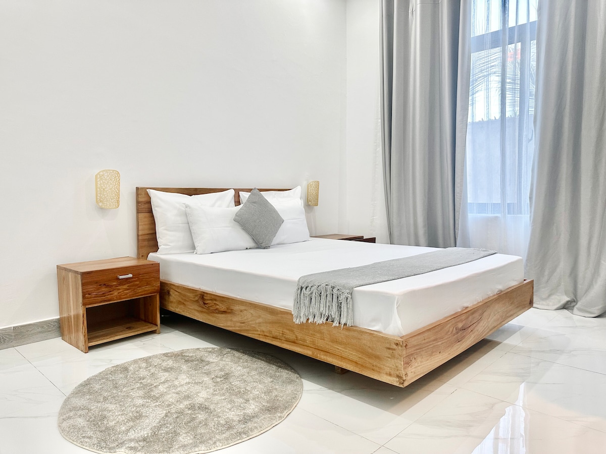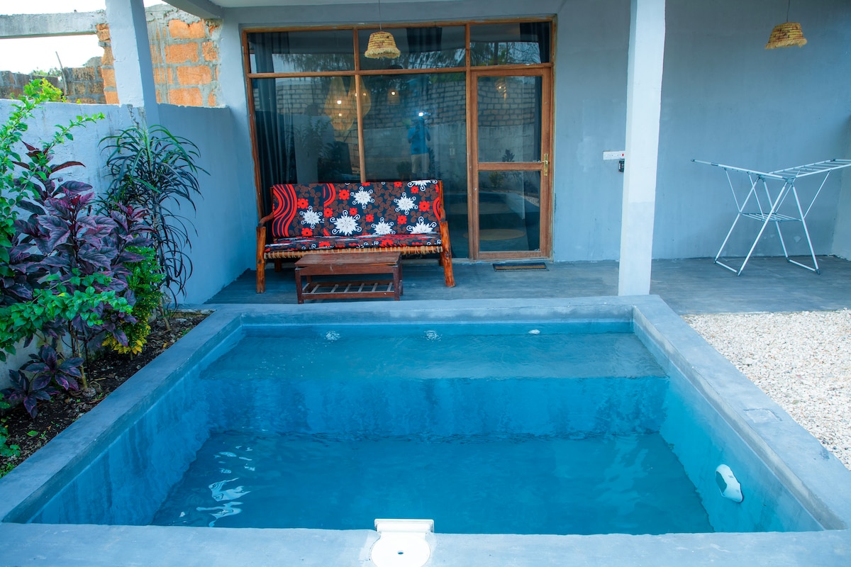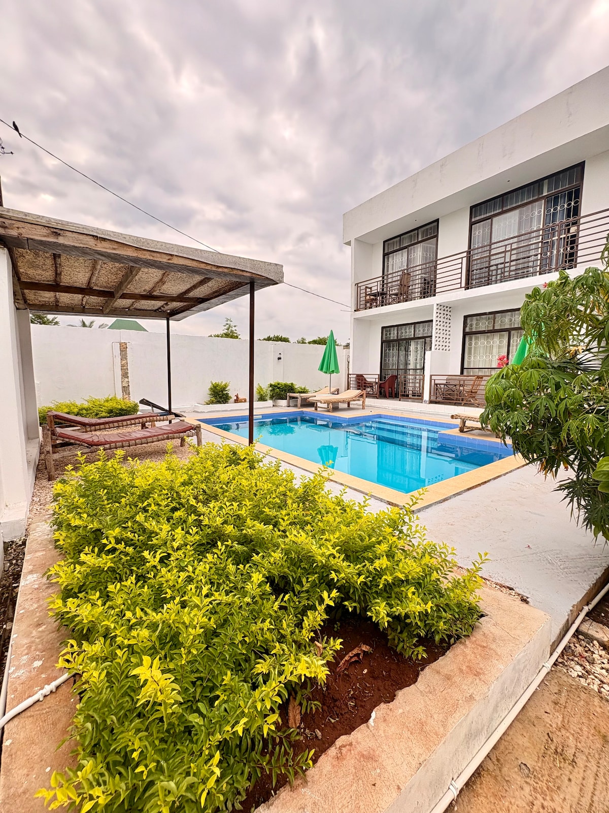 Relax and unwind in our newly build stylish apartments. Enjoy the pool in front of your private apartment or take the 7-8 minutes walk to the beach nearby. We are located away from mass tourism, so if you value your privacy this would be the place. Ideal for young newly wed couples! We can arrange safari’s to the mainland and day trips on Zanzibar as well. Shops and supermarkets can be reached within 5 minutes by car or moped. Or we happily deliver your grocery’s to your doorstep.