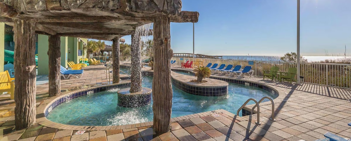 STARBUCKS ON SITE!!😎 Self check in, Ground floor condo so no waiting for elevators etc. located @ Grand Cayman Oceanfront Resort beautiful decorated sleeps 4 with a comfy king bed and queen sofa sleeper, south side ocean view an efficiency kitchen, smart TV. Indoor parking, pools/hot tubs/ lazyriver/ beach just steps from the room. The resort has a 4 story waterslide, tiki bar, breakfast buffet and the famous River City Bar & Grill next to the resort is voted best hamburgers on the beach