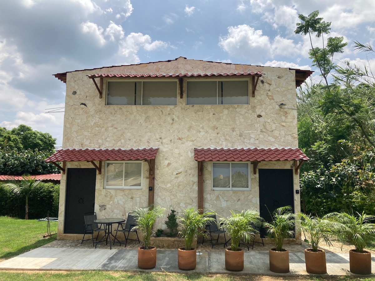 Bungalow Dúplex que puede ser familiar, ya que cuenta con un sofá que en realidad es una cama en dos niveles, una cama King side baño completo, en la parte baja tenemos la cocina y comedor con una bella terraza al jardín y un medio baño.