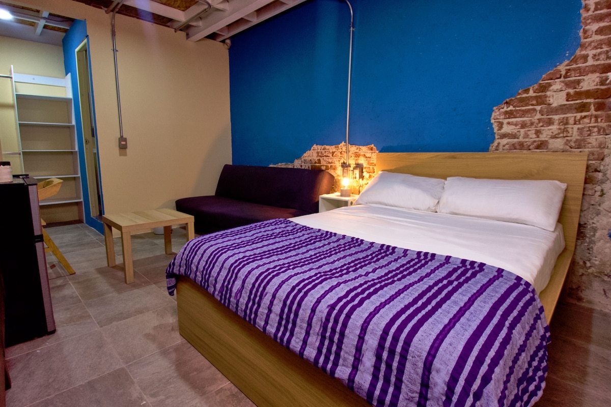 Private room, Loft, with mezanine for rent located only 3 blocks from the Zocalo. It has a double bed on the main floor, in the mazanine there is an other single and doble bed. Good wifi. Well equiped kitchen and natural light. It has access to a beautiful patio of the Hostal Luz de Luna. We are located in the heart of Oaxaca, on a busy street, the apartmen can be a little noisy when there is lots of traffic BUT we just installed a double cristal door to disminish the noise.