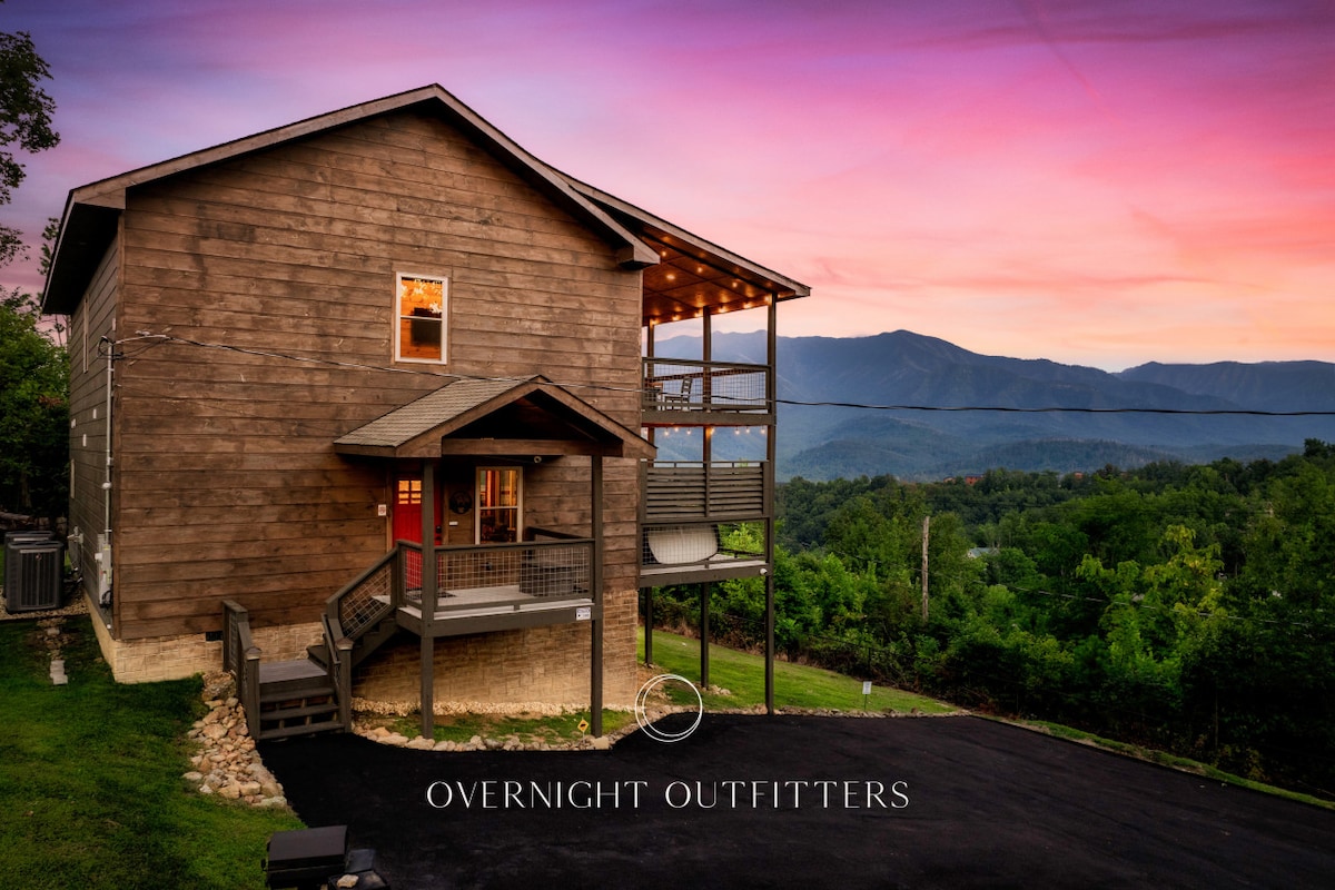Brand new modern build cabin steps away from the Gatlinburg Parkway! (1/3 mile) 3 bedrooms, 2 bath Sleeps 10 Amazing views off front and back. Very very private but so close to everything. Pool Table, Hot Tub, Golden Tee arcade game... Kitchen is stocked, grill in back yard. Can walk to parkway!! Driveway is slightly steep but flat parking at the top by the front door! (My wife's Honda Oddessey makes it up and down) also parking pad at bottom of driveway Pet policy: 2 🐶 max