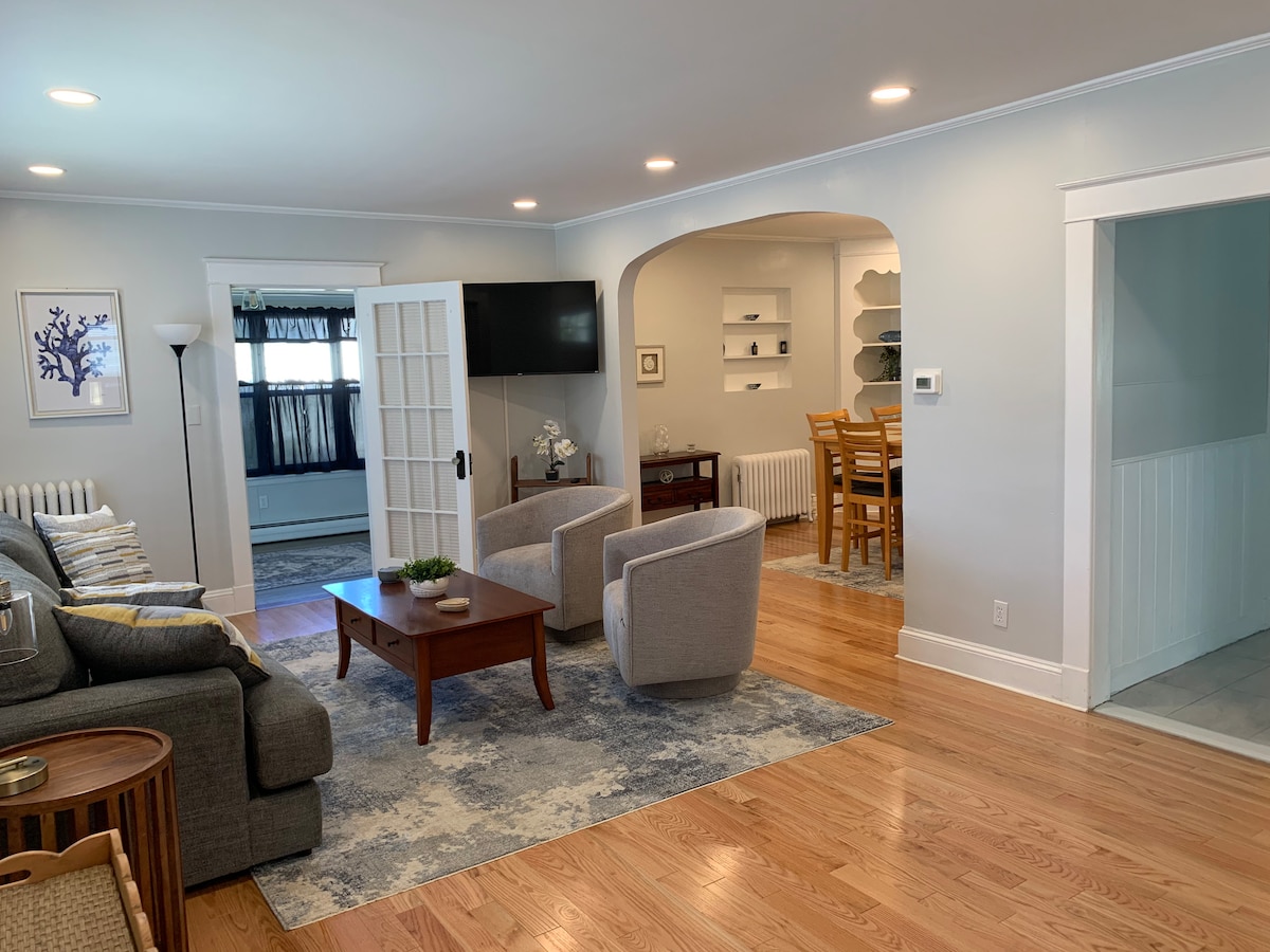 Spacious, charming, fully equipped family friendly home in the heart of New London's beach community. The apartment is quiet, private, attractive and comfortable. Private beach, wide open views of Long Island Sound and on site parking. Your carriage house apartment has a private entrance and is located on the second floor above our detached two car garage. Relax, get comfortable and enjoy your stay!