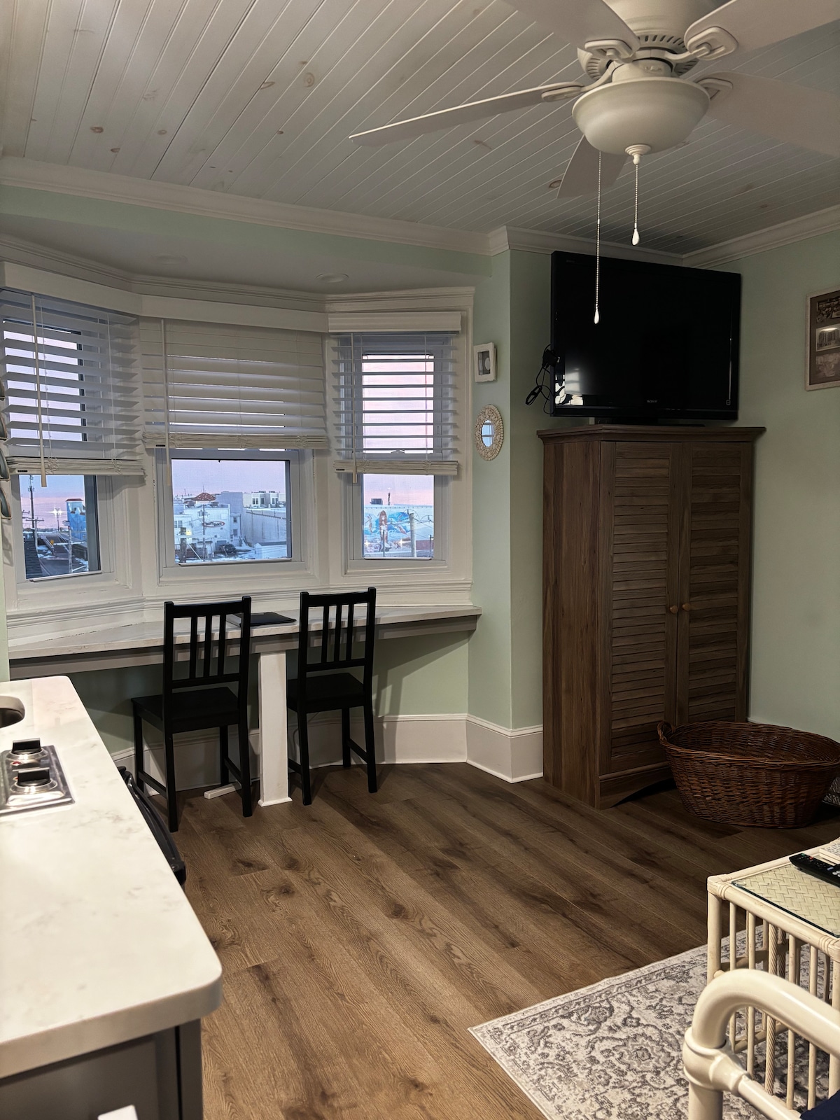 PRIME LOCATION in the Hanscom Hotel- Steps away from the Ocean City boardwalk and beautiful beach. Walking distance to restaurants and all major attractions. The historic Hanscom building has an old world charm with modern amenities such as keyless entry, wi-fi, and a cable-equipped Smart TV. Ocean City prides itself in being the leading family vacation resort, and our community is ready and eager to make your next visit a truly unique experience.