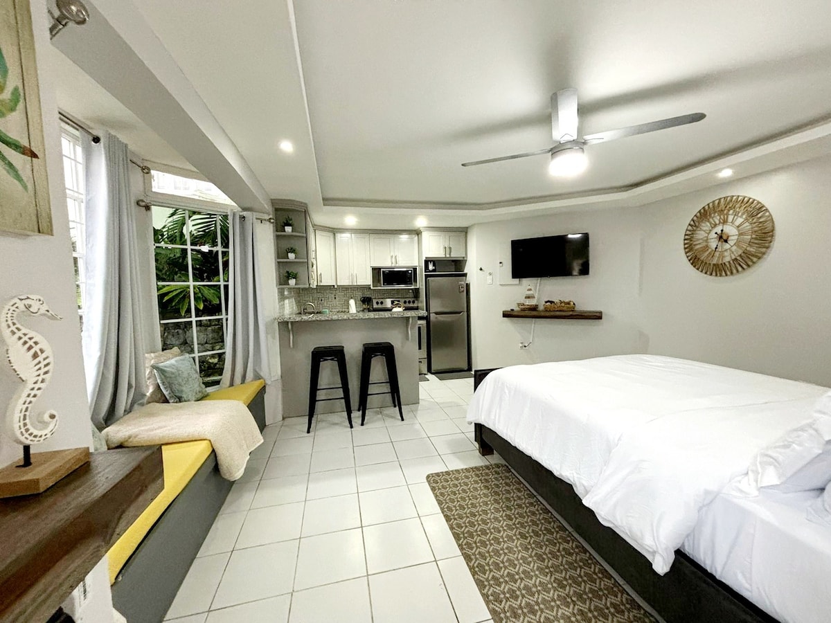 Post Melissa-All utilities are working. Modern poolside studio,city+ocean views. Alexa Smart & keyless entry. Central in Ocho Rios, gated 24-hr security, Sky Castles, 5 min drive to attractions (Dunn’s River Falls, Mystic Mountain) & stores. Porcelain tiles for a luxurious feel. Equip kitchen, smart TV, Safe, shower, 1 queen bed for 2 & a sofa bed for 1. Covered patio, free parking & access to 2 pools make this a must stay. A camera is above the front door, this is for guest safety and security.