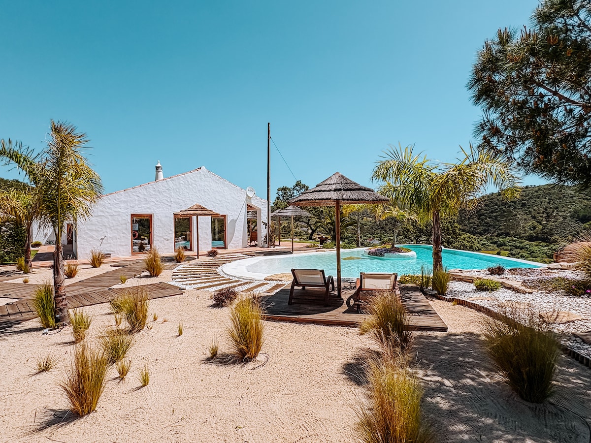 Amazing Alentejo experience. Stunning country house with private pool, set in tranquil orchard, 10 minutes from beaches, with 5 bedrooms, 3 bathrooms. Set on 1 hectare of private orange orchard, the spacious farmhouse offers tranquility, gardens and a large outside pool amidst well set terraces. Only a few kilometers away from Zambueira do Mar and other stunning and often wild beaches like Praia dos Alteirinhos or Praia da Meia Laranja. Ideal for peaceful enjoyment of nature.