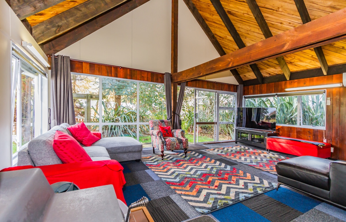 This bach is our happy place. Sat on 1/2 an acre it's an easy walk to central Ohakune's restaurants/bars/cafes and the supermarket. After walking, snowboarding, skiing or mountain biking relax on the deck or in the spa with a view to Mount Ruapehu. When you are ready for more action go to the games room for darts, pool or foosball. Both the bach and games room have heat pumps and TVs and of course there is wifi, plenty of parking, a drying room and heaps of wood for the fire.