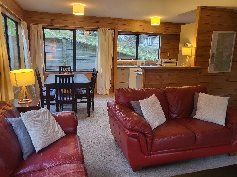 Relax with the whole family, partner, work mates, or friends at this cabin in Ohakune. All linen and towels are provided. Use of spa pool, free parking, 3 bedrooms sleeps 8 but could take 2 more on the sofa bed. Relax in front of fire and TV in the evening, play games, or snuggle up with a book. Perfect for a biking weekend too! BONUS - Sauna and games room available in our Lodge next door if we are in attendance. Please note mountain photos are not taken from the property.