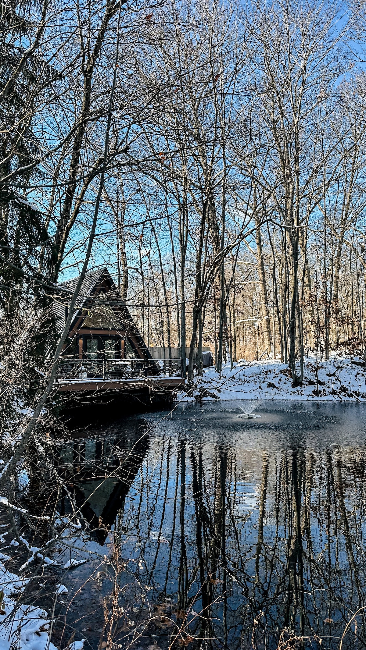 Forest Lane Aframe - @forestlane__ Escape to our cozy A-frame cabin nestled among the trees, overlooking a serene pond with a bubbling fountain. Enjoy mornings with fresh local coffee on the deck, afternoons kayaking or relaxing on the balcony and evenings soaking in the deep tub or unwinding by the indoor fireplace or outdoor campfire area . This relaxing space offers everything you need to unplug and recharge - nature, comfort, and a touch of romance - The perfect couples or solo getaway