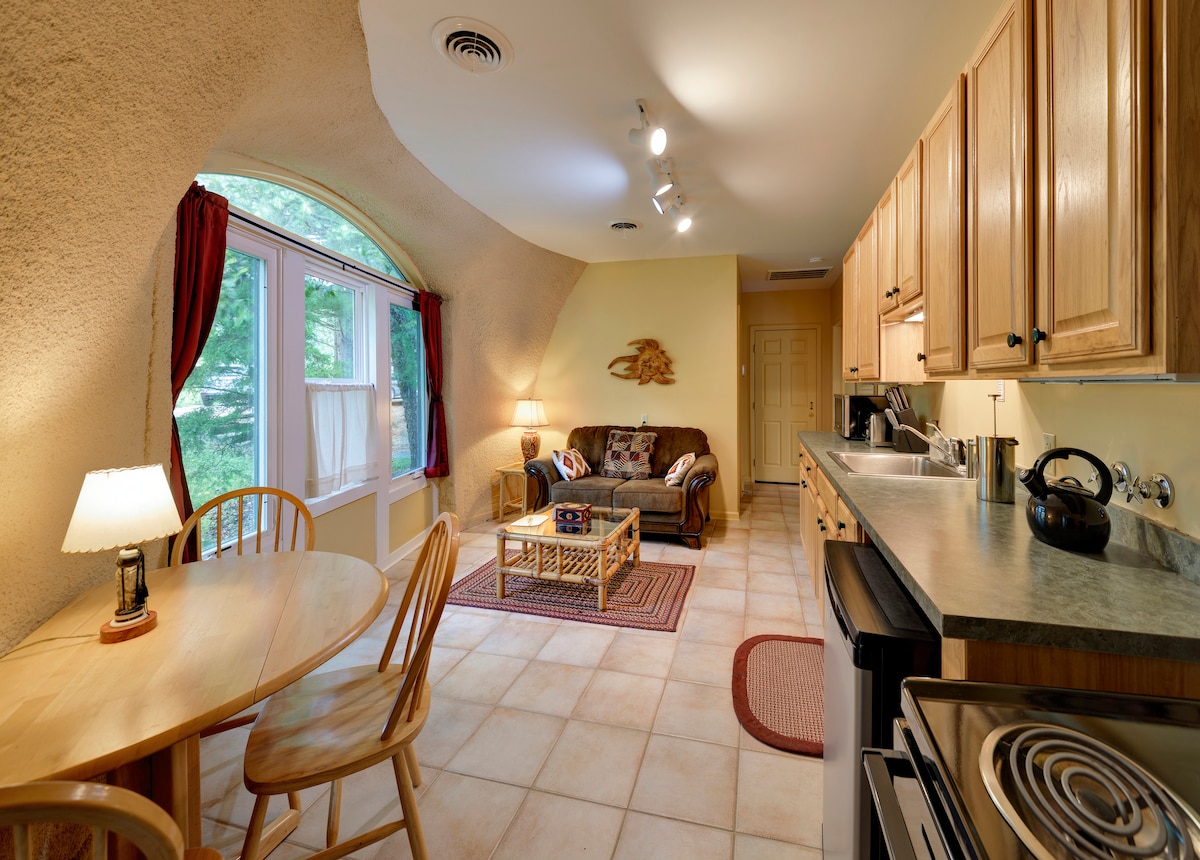 Toadstool Suite is a unique monolithic dome house with a handcrafted interior featuring native hardwoods and oak floors. Its curved design blends seamlessly with the natural landscape, reminiscent of a hobbit house. The suite is located at the Whispering Springs Complex within the Highlands Nature Sanctuary. The property features a tranquil pond, the perfect place to relax and reconnect with nature and enjoy the soothing sounds of chorusing frogs right outside your window.