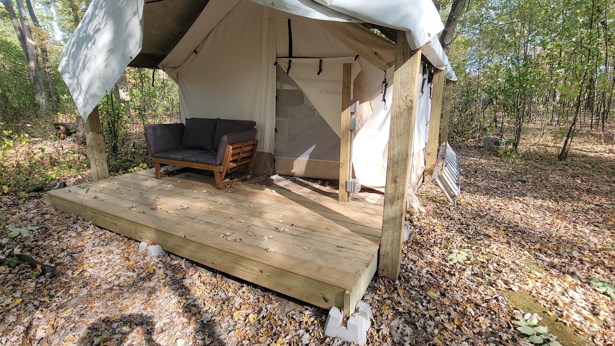 Reconnect with nature at this unforgettable escape at Valley Overlook Campground. This charming "glamping" tent is nestled in the heart of Cuyahoga Valley National Park. Cuyahoga Valley National Park offers an abundance of outdoor activities, including picturesque hiking and biking, farm markets, the historic village of Peninsula, Scenic Railroad, and more. Whether you're seeking a romantic getaway or a peaceful retreat, our glamping tent in Cuyahoga Valley National Park is the perfect choice.