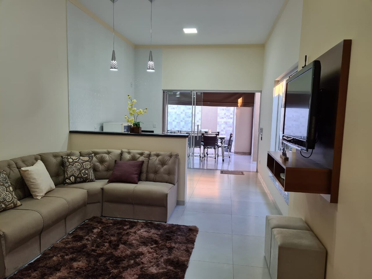 PARCELAMENTO EM 6X SEM JUROS! Faça tudo a pé. Estamos à 200 metros da entrada do estacionamento do Thermas dos Laranjais e do Villa Mall Olímpia Park - Shopping Mall com Burger King, Banco 24h, brinquedos, artesanato e muito mais. Casa nova, limpa e organizada. 2 quartos com ar-condicionado. Sala com cozinha americana com ar-condicionado. Área Gourmet com churrasqueira, forno elétrico e filtro IBBL. Wifi e alarme. Garagem coberta.