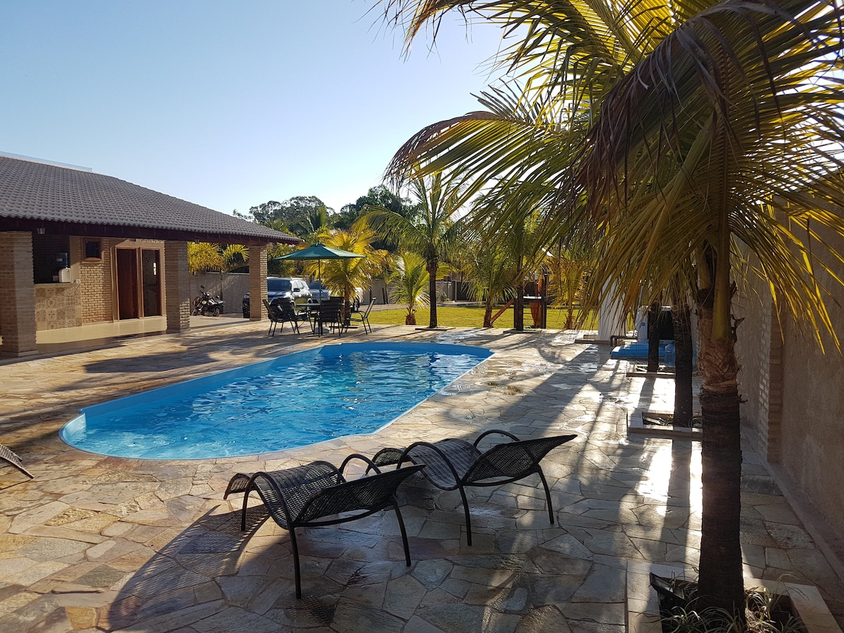 " Casa de Temporada Nascer do Sol C/ Wi-Fi Tv 32 Smart, 3 Quartos c/ ar condicionado 1 quarto com ventilador teto, Garagem 3 carros, Portão Eletrônico, camas Box, 3 Banheiros, tomada todas 110v. Piscina Aquecida Solar. 3,2 km do Park. Bairro Bem Seguro e Tranquilho.... Padaria, Açougue, Mercado a 200 metros.... Obs: Sobre o Aquecimento Solar da Piscina. O Sol de Inverno não e Suficiente para aquecer a Piscina..