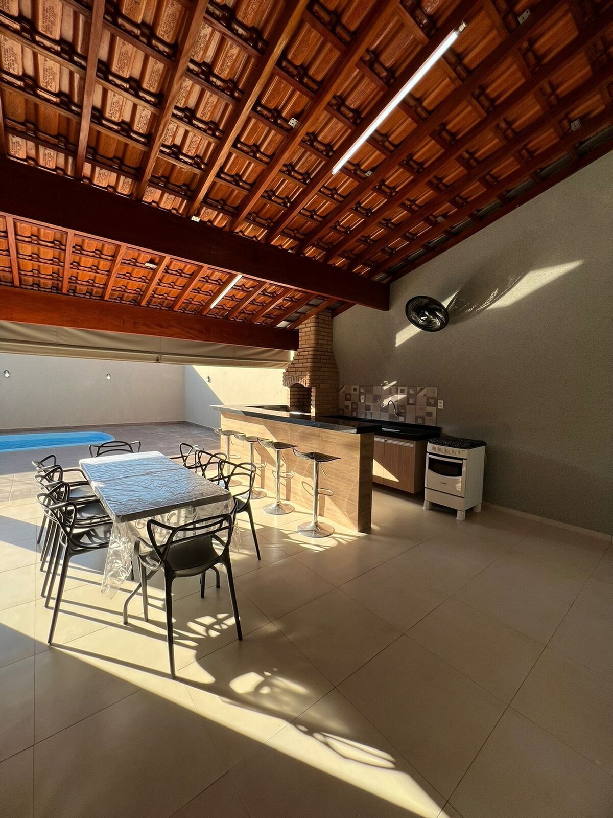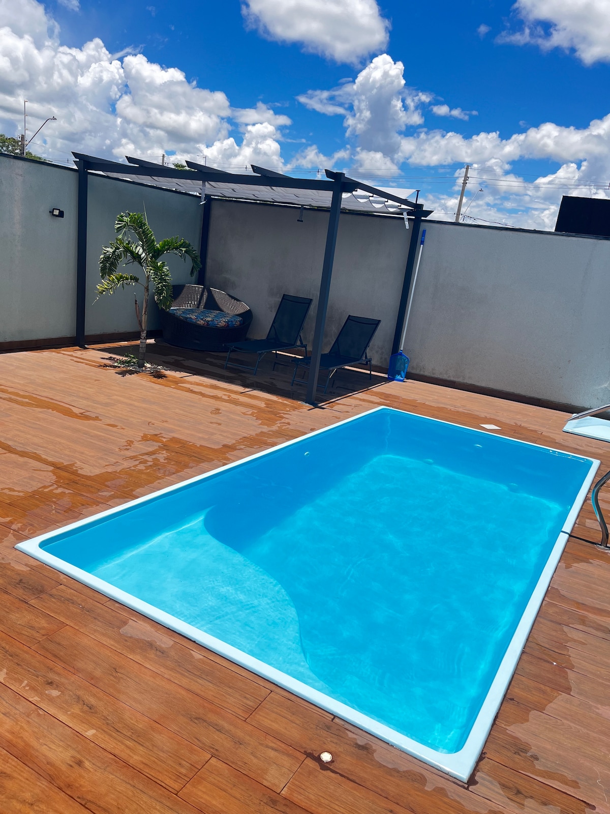 Possui piscina com aquecimento elétrico, com hidromassagem e cascata, área com churrasqueira, 3 quartos sendo 2 suítes independentes, todos com ar condicionado e ventiladores de teto, banheiro social, cozinha equipada, sala com Tv à cabo, Wi-fi e garagem para 03 veículos. Está muito bem localizada, próxima à padaria, açougue, pastelaria, hamburgueria e esfirraria; a 500 metros do supermercado e de 7 a 10 minutos dos parques, trajeto de fácil acesso.