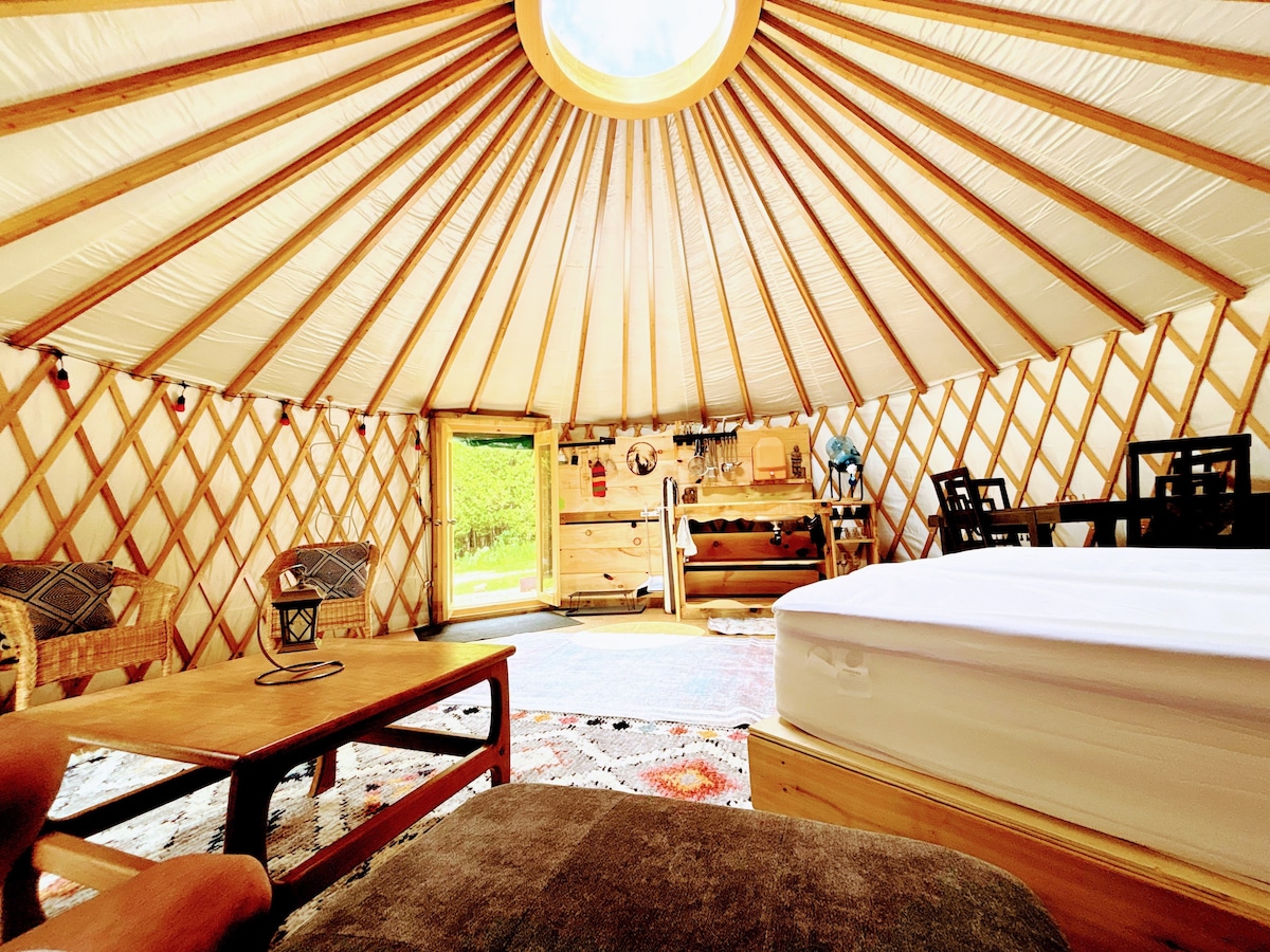 Reconnect with nature at Tall Pines Nature Retreats, where a luxurious hand-painted yurt with an indoor soaker tub offers comfort and calm in a forest sanctuary on a boutique horticultural farm. Stargaze by the fire, unwind beneath intricate ceiling art, or explore a magical riverside. Paddle, swim, or float with seasonal use of canoe, kayak, SUPs, or snowshoes. This is a registered agri-tourism farm offering a nature and wellness retreat—not a typical short-term rental.