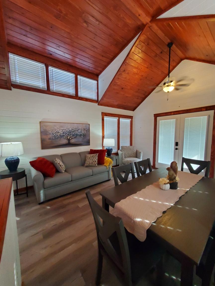 Relax with family and friends at this peaceful lake getaway. This charming cottage is nestled in the woods, offering guests a private retreat to recharge and reconnect. Enjoy lake access from your dock, bring the boat and tie off at your own slip, or cool off with the kids in the pool! The cottage is a 2 bedroom, 2 bath home with a beautiful stone fireplace and a cozy screened-in porch. It offers amenities for 4, a dock with boat slip for up to a 24' boat, and neighborhood pool access.
