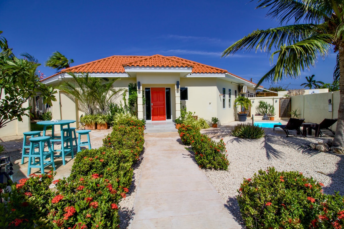 Experience Aruba at this cozy home featuring an extra-large private pool in a tropical garden.The spacious pool area boasts a deck with comfortable lounge chairs, an outdoor patio, with a grill. Enjoy your day by the pool or take a short 15-minute stroll to the nearest beach. Inside, a modern kitchen equipped with all essentials awaits. The entire house is air-conditioned, and the bedrooms are both modern and roomy. Make lasting memories with friends and family at this perfect vacation home.