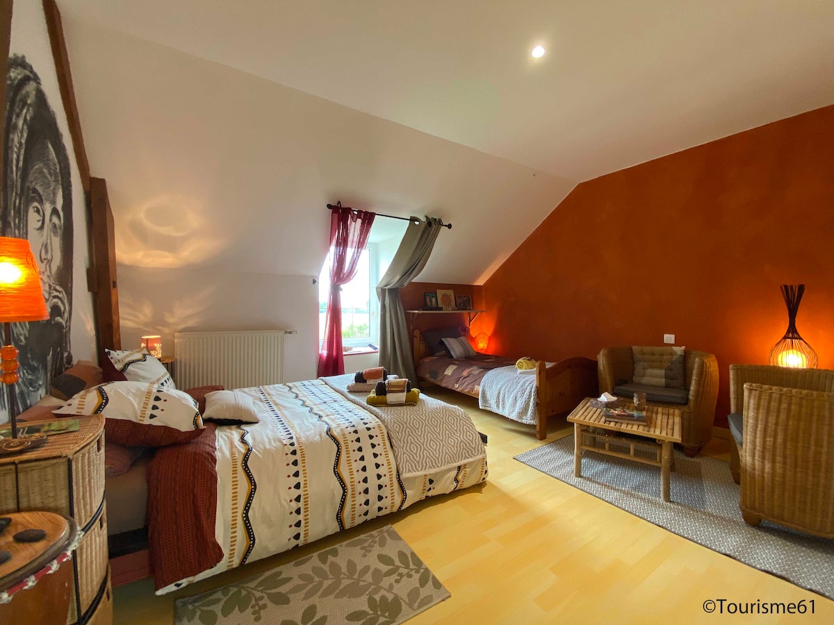 Suite de 2 chambres privée, un salon avec 1 canapé lit,dans une belle maison de charme, au Moulin de Boiscorde, ancien moulin du 16ème siècle sur un domaine de 31ha de jardins, forêts, prairies… Idéal en solo, couple, famille, amies (s), séjours détentes et/ou travail. Parfait pour se ressourcer, faire des randonnées a pieds, a vélos… Au coeur/centre du Perche Ornais. 1h45 de Paris. 10km parc Naturel Régional du Perche. Proche Belleme, Mortagne au Perche, Nogent le Rotrou, La Loupe, longny…
