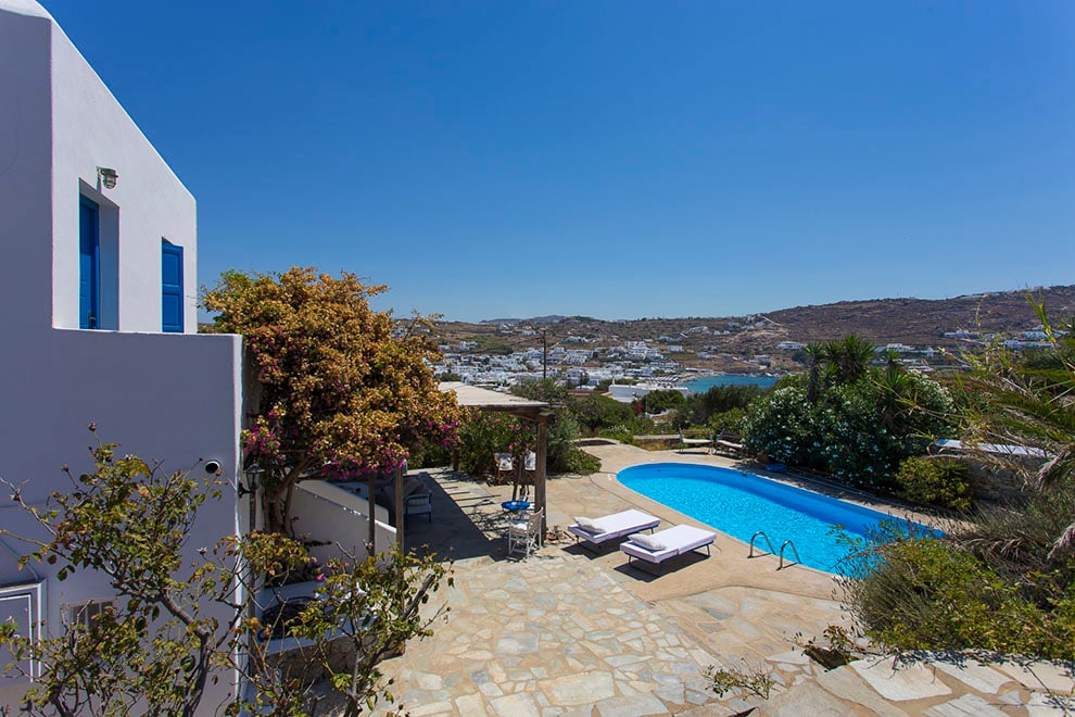 Villa Tatiana, is a spacious 3-bedroom villa in a quiet location, just a 5 minute drive away from Mykonos Town, offering a large swimming pool and a very big terrace. The rate is for 6 persons, however there is possibility for accommodating up to 8 persons, as the sofa can be modified to a bed for 2 extra adults, at an additional cost, depending on the season.