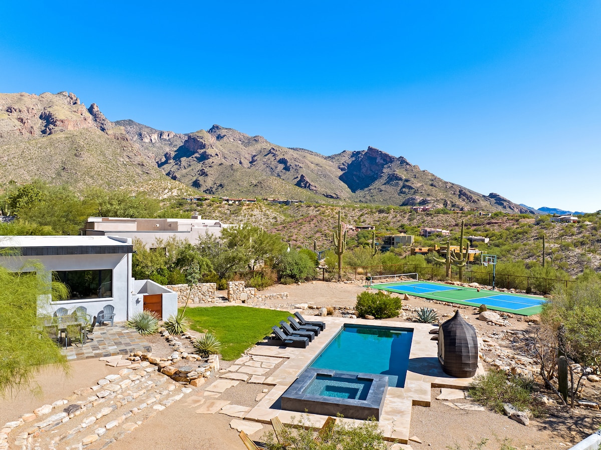Nestled in the Catalina foothills. Convenient to Mt. Lemmon, Arizona wine country and downtown Tucson. Unobstructed views of the Catalina Mountains, enjoy coffee as the sunrises or an end of day soak in the spa as the sun sets. Watch the deer graze on the cactus flowers or listen to the coyotes sing to the moon. A quiet oasis in the desert. Enjoy the pool and outdoor kitchen. Traveling in a motor home, private gated parking is available with electric hookup.