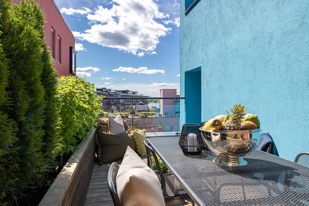 Enjoy breakfast in bed or at the bakery downstairs before a refreshing morning swim. The Nordic design creates a cozy vibe in this brand-new top-floor apartment with afternoon and evening sun on the private balcony. Just 5–10 min walk to everything Oslo offers, restaurants, bars, cafés, the fjord and Oslo downtown. Spend days on the balcony or the rooftop terraces in the building with sun from morning to evening and full view of the Bjørvika district. Easy access with car from parking basement.