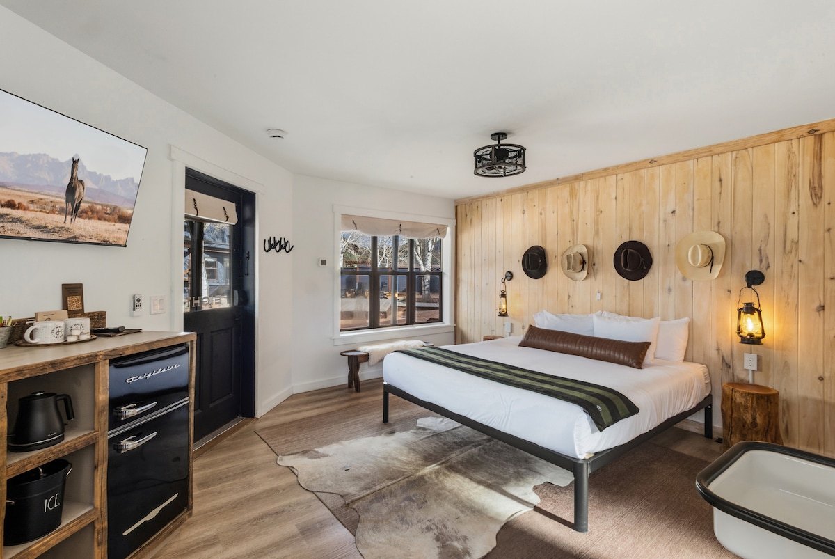 Kick off your boots in our 260 sq. ft Standard King Room, appointed with a unique modern-western aesthetic. Accented walls in aspen wood are adorned with western artwork, antiques, and thoughtful details from the regions rich ranching history. The room includes a small desk for your convenience. (We don't have a front desk or reception)Max occupancy 2, 2 medium size pets under 75lbs. are welcome in this room with a $30 fee per pet, per night.
