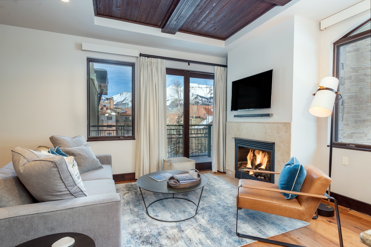 King bed with Egyptian cotton linens Approximate square feet: 1,050 sqft Deck with fantastic mountain views Gas fireplace Living area with sleeper sofa Chef’s kitchen with Wolf gas range, Subzero refrigerator and all the essentials Dining area with seating for six Additional half bathroom Susanna Kaufmann body care amenities LED smart televisions throughout with Bluetooth sound bar Washer and dryer Complimentary Wi-Fi Safe