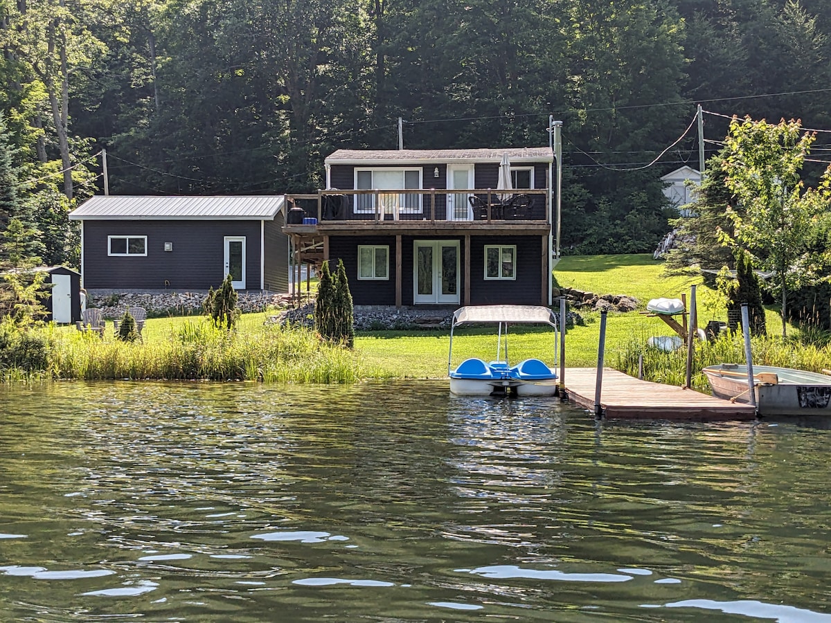 Charming and cozy lakefront on beautiful Lac Chapleau. Over 350ft of private shore. Spacious screened porch, large deck-private dock-sandy water access-fire pit and BBQ. 2 Bedrooms: 2 Queen-1 Double&Single. Indoors: Fully updated kitchen-4 piece bathroom with heated floors- cozy wood-burning fire place. WiFi+TV. Close to grocery-hiking-biking-skiing. Only 40 min to Tremblant Village. *Sauna not operational and firewood is not provided.