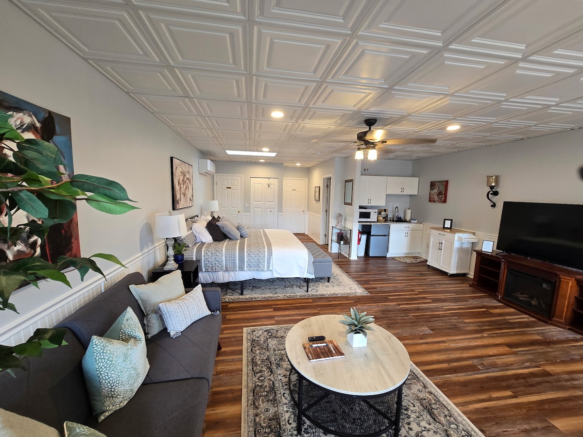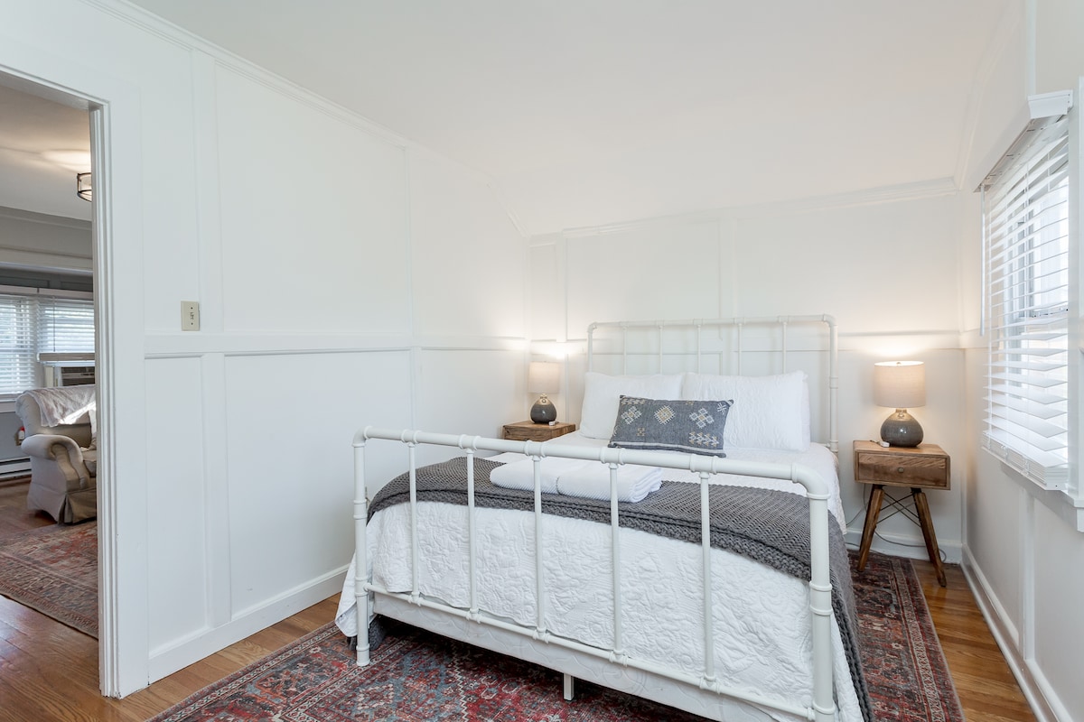 This renovated historic carriage house is 2 blocks from Harrisonburg’s vibrant downtown. The space is light and airy with gabled ceilings and sky-lights that open. It is located on a leafy residential back-alley, with private entrance and off-street parking. JMU’s bluestone campus is a 10 minute walk away. We’ve set-up this space for a range of guests: from JMU parents visiting their children to people traveling for business who are seeking a more textured experience with home comforts.