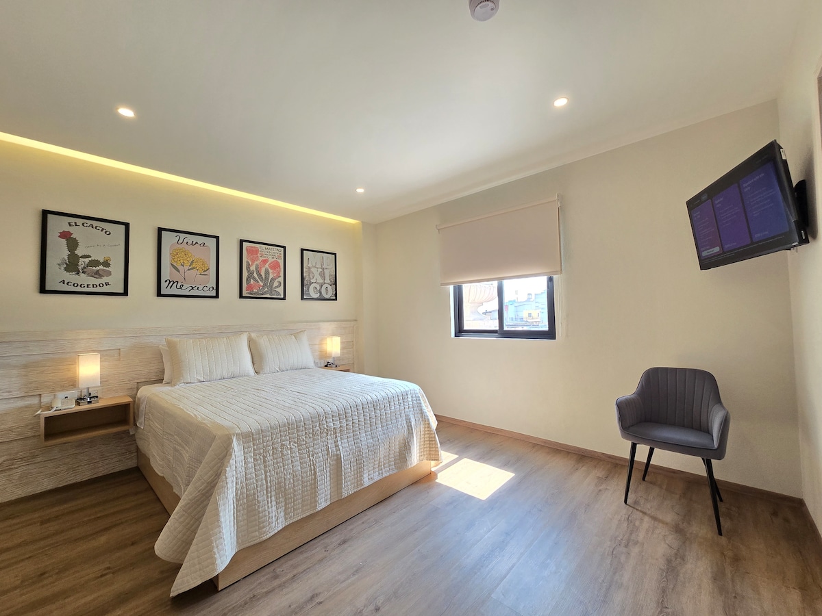 Confortable departamento con extraordinaria ubicación, muy cerca del Zócalo de la Ciudad ideal para parejas, home office y/o descanso, cuenta con una recámara con cama queen size colchón memory foam para tu comodidad; sala, comedor, cocina, y baño completo. Internet 80 Mb, 2 Smart TV, Netflix, Refrigerador, horno microondas, cafetera, burro para planchar, plancha, secadora. Servicio de toallas y todo lo necesario para cocinar. Lavadora y secadora en área común.