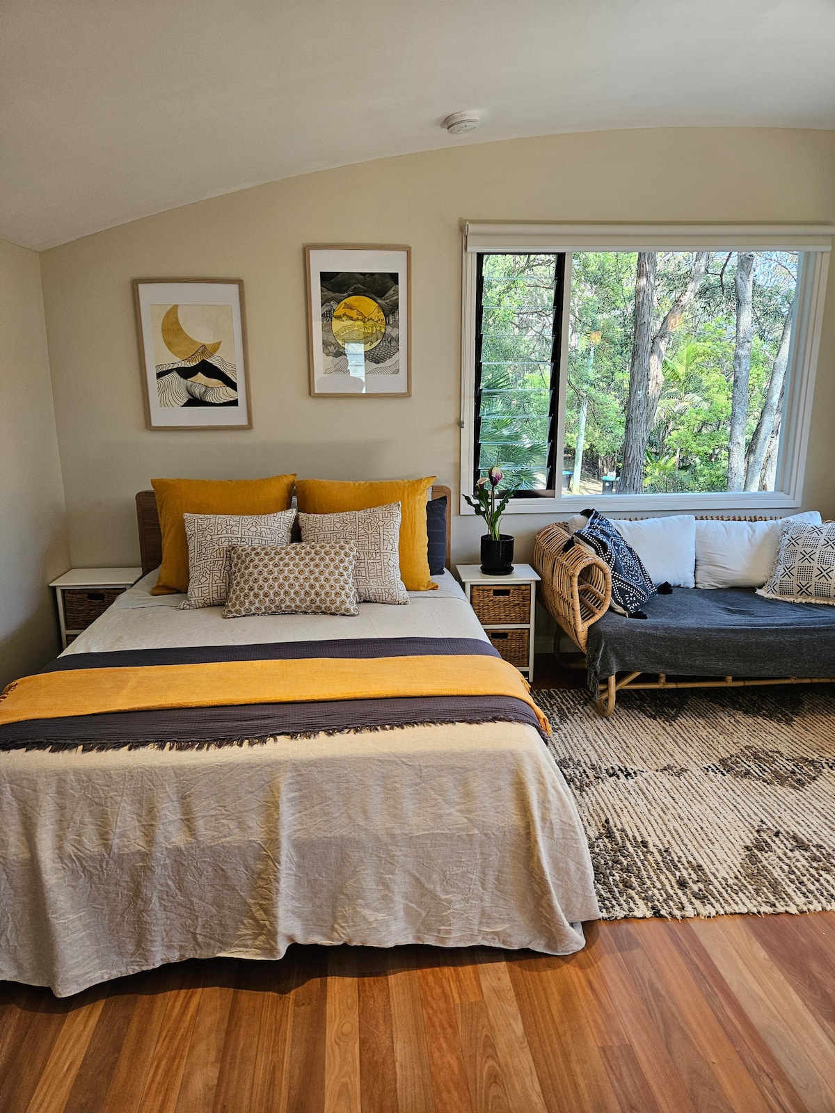 Treat yourself to a lux beach escape! With private entry, tucked above the dunes on Bungan Beach, nap to the sound of the waves, enjoy sunrise from bed, and sip wine by the outdoor firepit. Drenched in northern sun, winter here is the best time of year! With 1 king bed (lux memory foam) plus 2nd double bed, you can sleep up to 4 (2 adults +2 children max, or 3 adults). The pics tell the story…you wont want to leave!