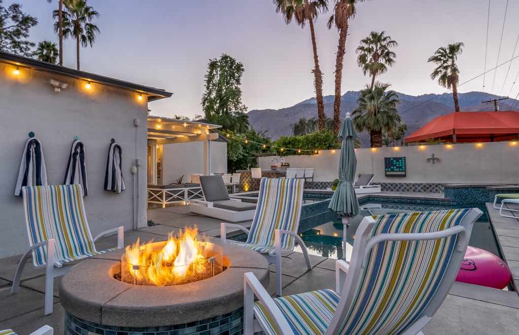 The Palmetto House - A Luxury + Mid-Century Oasis with a private resort-like pool with cabana, fire-pit, hot tub & amazing views of the San Jacinto mountains located about 2 miles from Downtown Palm Springs. This mid-century modern home was designed by legendary Architect James Cioffi and offers a spacious layout and seamless flow to the pool area. High ceilings and windows let tons of natural light flow in creating an oasis both inside and outside.