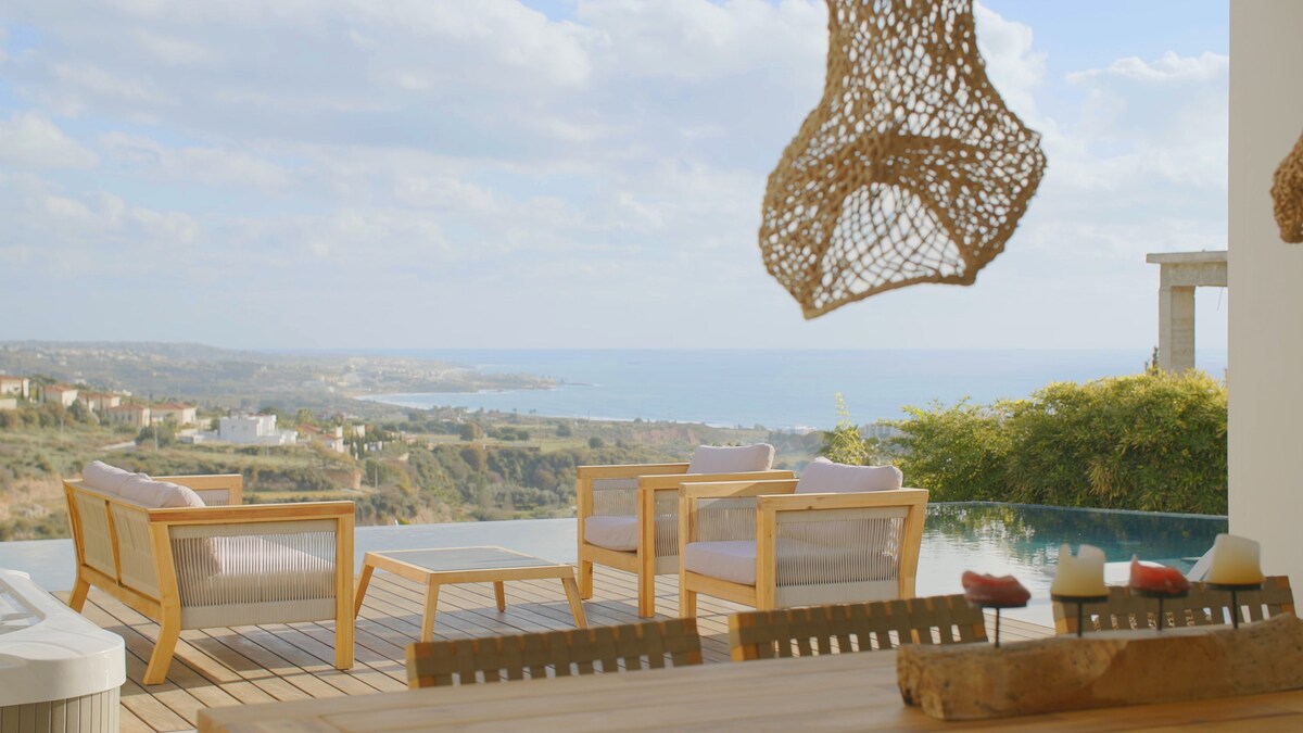 This is a luxury 3 bedrooms villa that sleeps 6 people, with a beautiful view, situated just a minutes away from the nearest beaches and the city center by car. The villa has an outdoor luxury hot tap Jacuzzi and a BBQ facilities. and a shared swimming pool. This is a nice choice for families, couples, and a group of friends who wish to have a convenient, relaxing, and peaceful stay. Located in a private/quiet area of Chloraka . Special Reduced price for 2 guests! Claim it before booking.