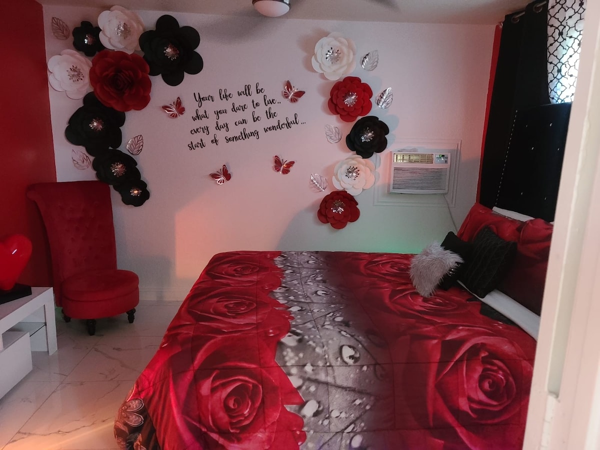 luxurious studio with private entrance, all decorated in black and white colors, has a kitchen with all kitchen accessories, queen bed, folding bed for another additional person, tv , air and heating are individual for the rest of the house since the studio has a mini split installed, it has a smoking area outside