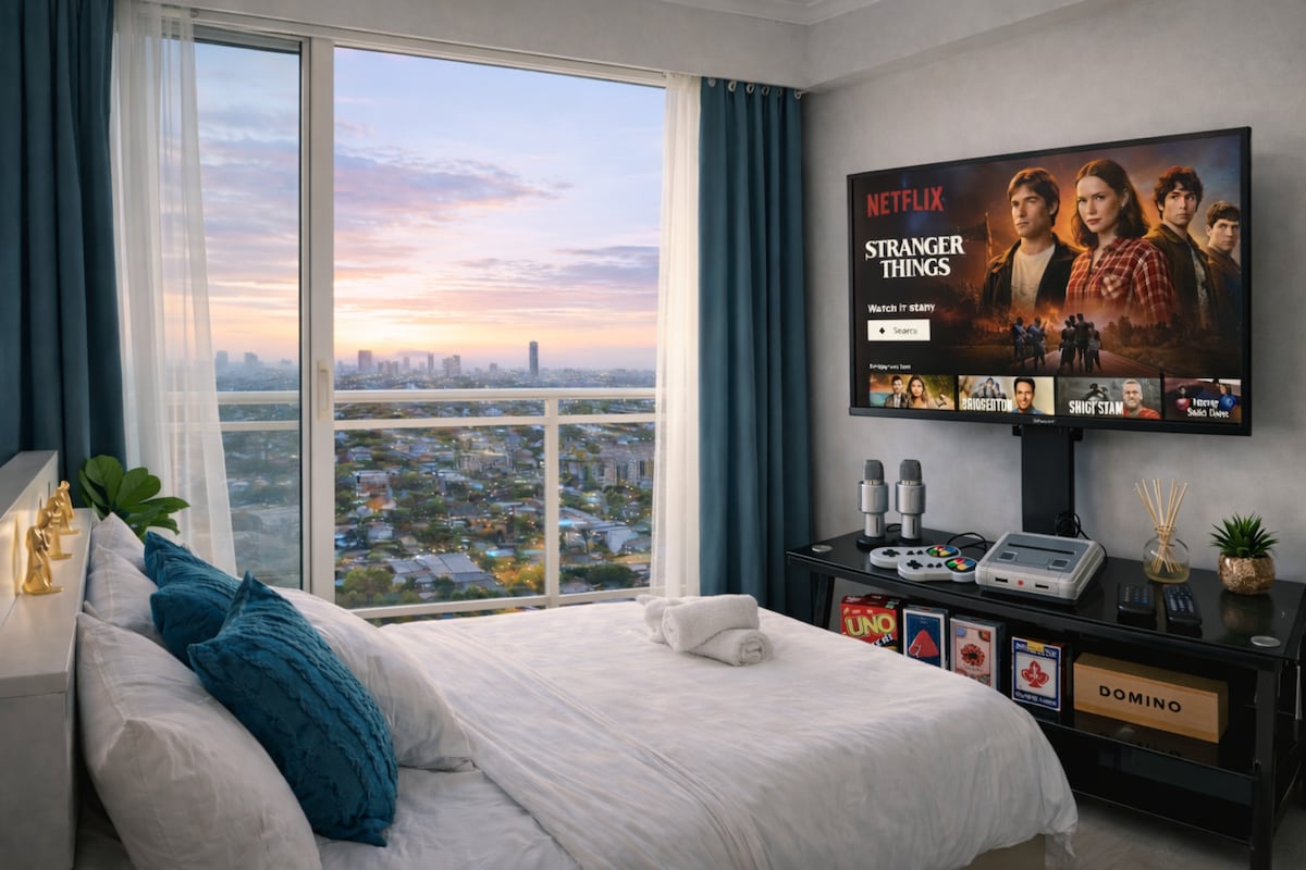 Welcome and enjoy a private space to call home during your stay while you visit the progressive city of Parañaque. Located only a few kilometers from the NAIA airport, Malls, Restaurants, and leisure places, perfect for weekend getaways, staycations, or work-from-home alternatives. Chill and relax while watching your favorite Netflix Series on our 49 Inch 4K Samsung Curve TV with Dolby Digital Samsung Soundbar system partnered with high-speed (200mbps fiber internet)to enjoy your experience.
