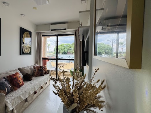 LINDO FLAT MOLILHADO (44m²): -Projeto arquitetônico; -Ar condicionado; -Nascente; -Varanda; -Cozinha com armários, bancada, geladeira e microondas; -TV, sofá, mesa e rack; -Quarto com cama de casal (Queen) e armários; -Banheiro com armário embutido, espelho e blindex; -Lavanderia. AREA DE LAZER: -Piscina; -Sauna; -Academia; -Quadra de squash. Excelente localização: em frente ao melhor shopping de Brasília, aeroporto, rodoviária interestadual e estação do metrô. Serviço de hotelaria 24h.