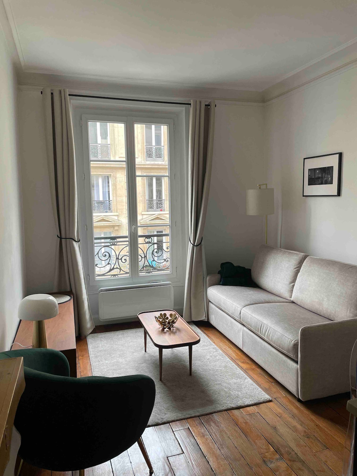 Spacious studio ideally located within walking distance of the Champs-Élysées, Madeleine, and the Grands Magasins. Safe building and lively neighborhood. The bright living area features a comfy sofa and a queen-size bed for restful nights. A fully equipped kitchenette and dining bar make meals easy. Elegant bathroom with Italian shower. High-speed broadband and Netflix included. Surrounded by restaurants, cafés, and shops for an authentic Parisian stay.
